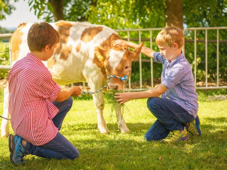 Unsere Gästekinder haben die einmalige Gelegenheit, unsere Kälbchen nicht nur zu streicheln, sondern ihnen auch neue Namen zu geben!